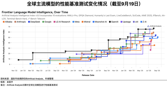 国际市场调研机构Artificial Analysis长期对全球主流模型进行性能基准测试。截至9月19日,阿里巴巴的Qwen3-235B-A22B-Thinking-2507性能仅次于OpenAI的GPT-5和o3、谷歌的Gemini 2.5 Pro、xAI的Grok-4,位居全球第四。DeepSeek-V3.1紧随其后,位居全球第五。