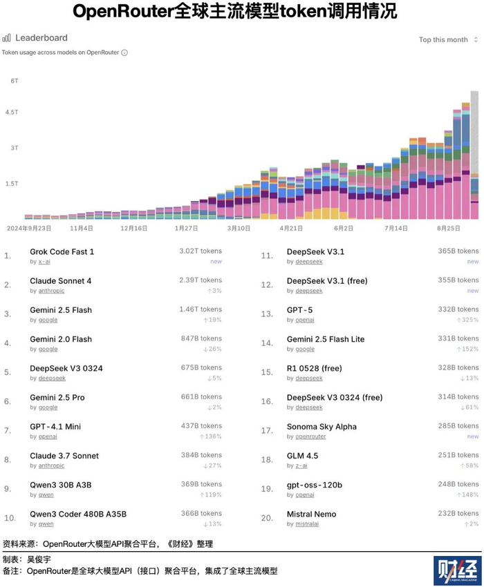 OpenRouter是全球大模型API(接口)聚合平台,它集成了全球主流模型。OpenRouter数据显示,截至9月18日,阿里巴巴Qwen3系列两款模型(Qwen3 30B A3B、Qwen3 Coder 480B A35B)的Token月消耗量分别位居全球9和第10;DeepSeek-V3.1系列两款模型的Token月消耗量则分别位居全球第11和第12。