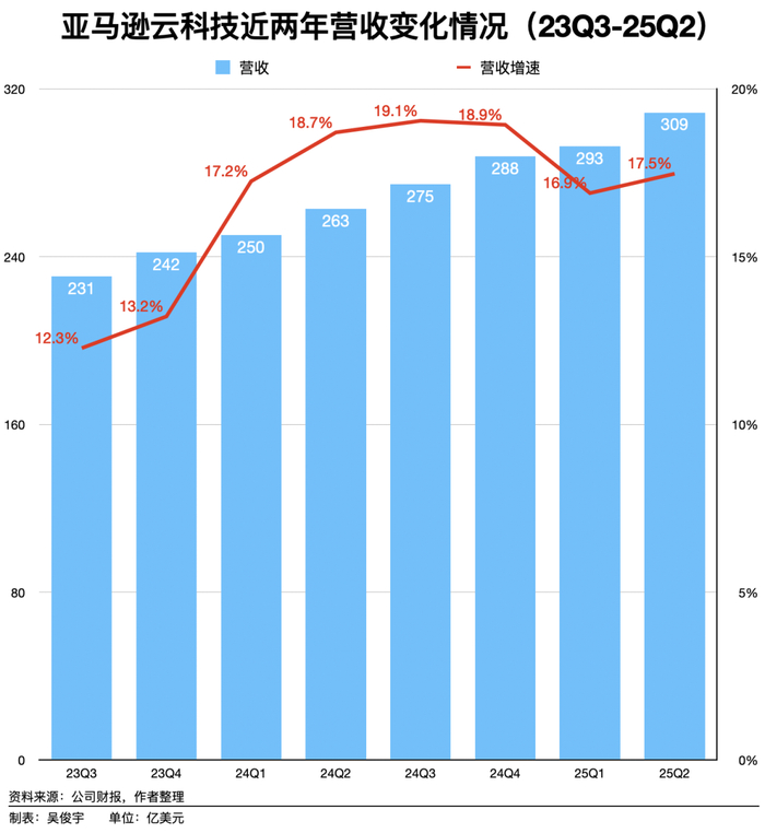 大模型为亚马逊云科技的生成式AI业务带来了数以万计的新增客户,这同样也带动了亚马逊云业务的收入增长。亚马逊近两年的财报显示,2025年二季度云业务营收增速17.5%,相比两年前的2023年三季度同比提升5.2个百分点。