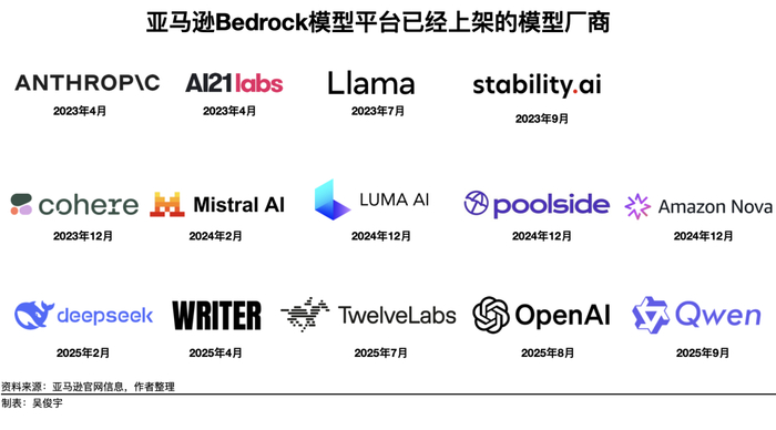 把全球主流模型纳入自己的生态,哪怕是微软、阿里巴巴等云计算厂商投资或自研的模型也不例外——这是亚马逊云科技的一贯做法。