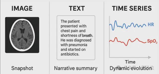 △图1.不同模态的医疗数据正如图1所示,如果将患者的生命历程比作一部电影,现有的AI往往只能捕捉到零散的帧画: