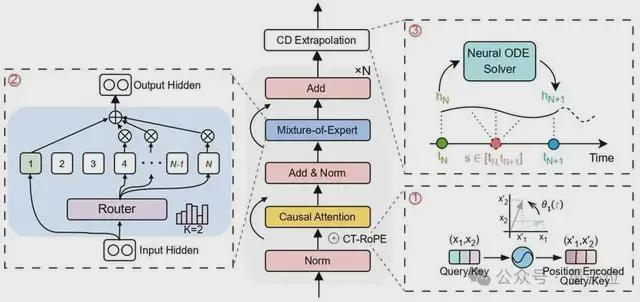 △图3.MIRA的架构MIRA的架构如下:①接收不规则时间序列和时间戳作为输入,并应用CT-RoPE进行连续时间编码。②混合专家层根据频率路由到不同的Expert。③Neural ODE模块将潜在状态演化到任意目标时间戳,从而实现灵活的时间感知预测