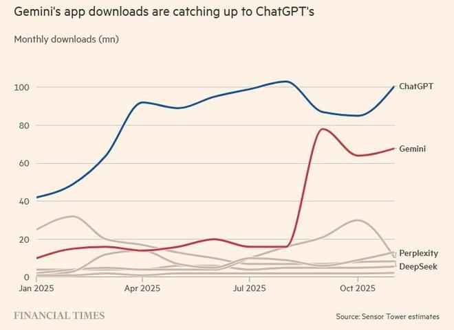 市场数据显示,谷歌正在多个维度缩小与OpenAI的差距。据Sensor Tower数据,11月Gemini的月度下载量达到1.008亿次,而ChatGPT为6780万次。