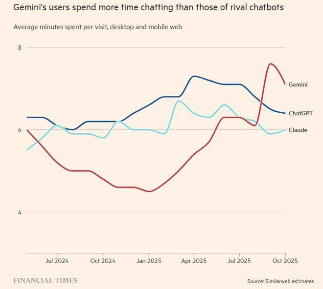 更值得注意的是,用户现在在Gemini上的聊天时间已超过ChatGPT或Claude等聊天机器人竞争对手。