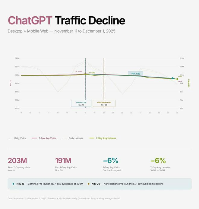 据Deedy Das统计,自谷歌Gemini 3发布以来的两周内,ChatGPT的每日独立活跃用户数(七天均值)已下降6%,显示出竞争压力的直接影响。虽然OpenAI仍拥有超过8亿周活跃用户,在整体聊天机器人使用中占据主导地位,但用户正在向谷歌流失。