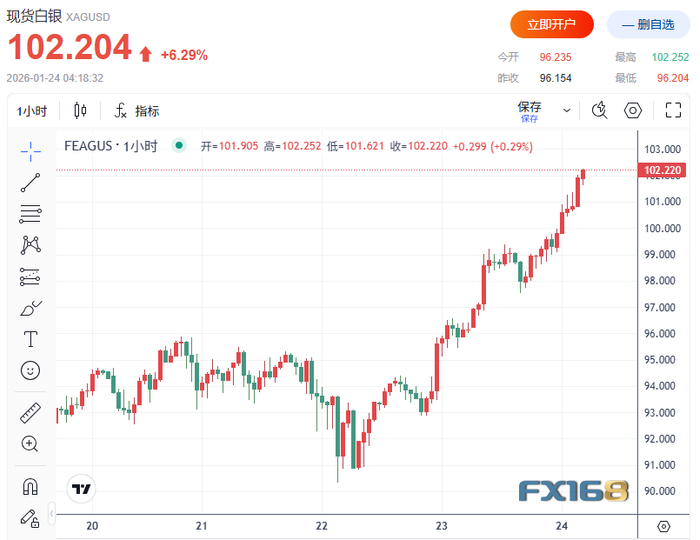 美盘时段,在突破100美元/盎司大关后,现货白银持续上涨并接连突破101和102美元/盎司,日内涨超5美元,续创新高,日内涨幅超6%。