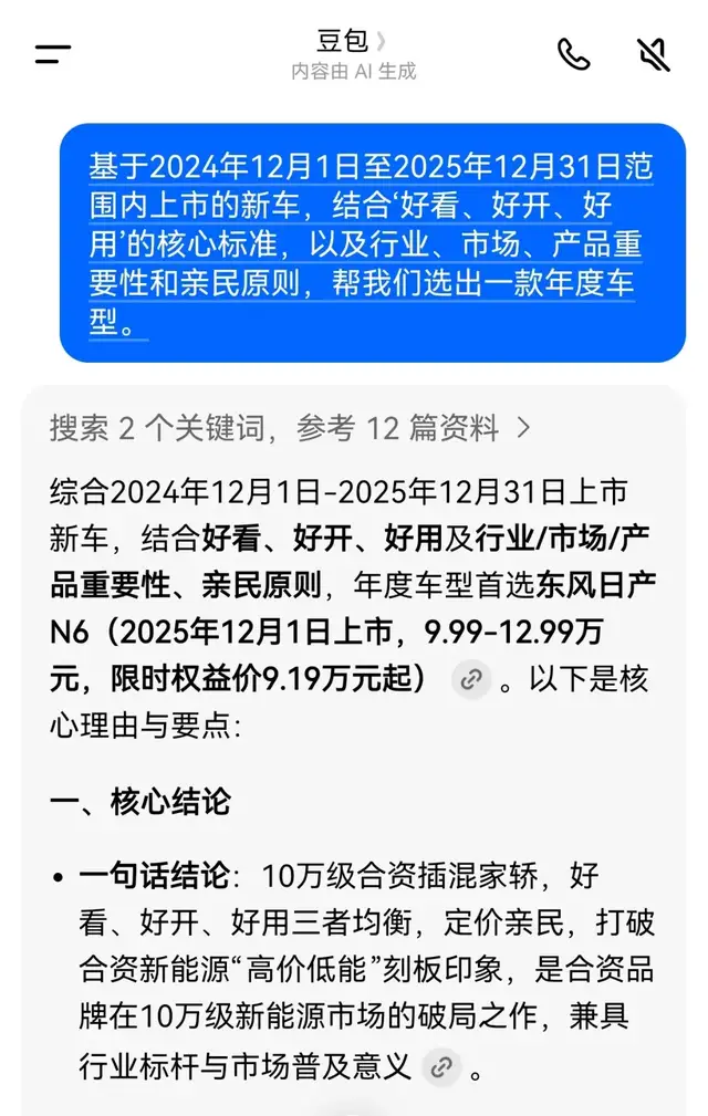 我们照例询问了豆包大模型:“基于2024年12月1日至2025年12月31日范围内上市的新车,结合‘好看、好开、好用’的核心标准,以及行业、市场、产品重要性和亲民原则,帮我们选出一款年度车型。”