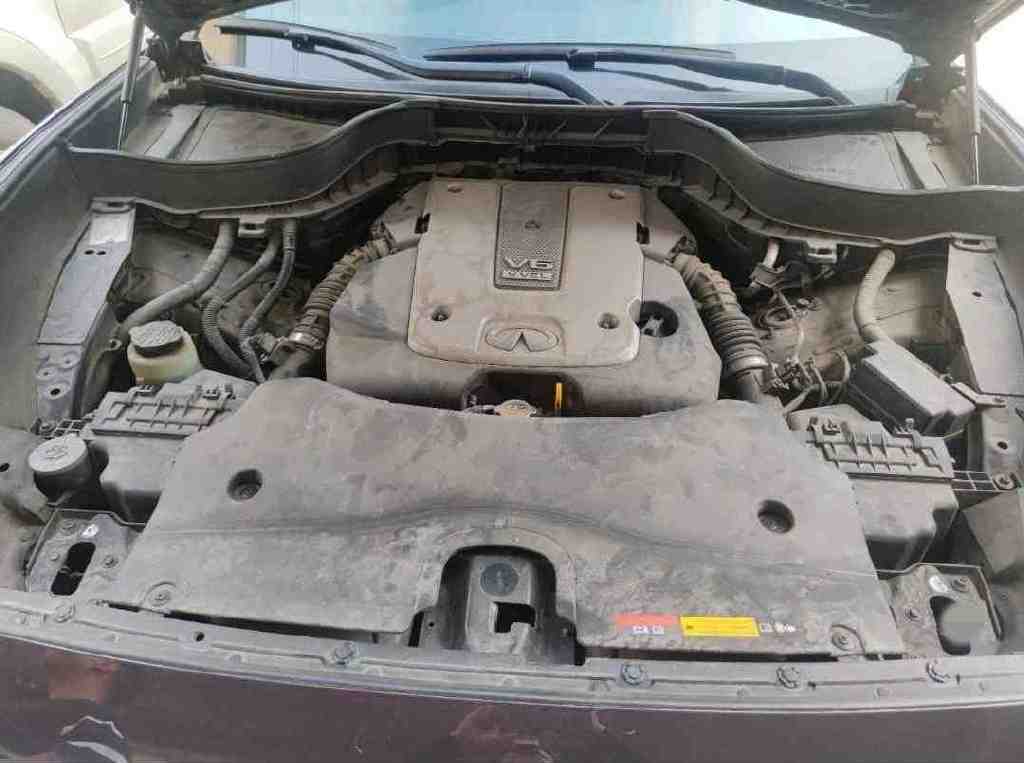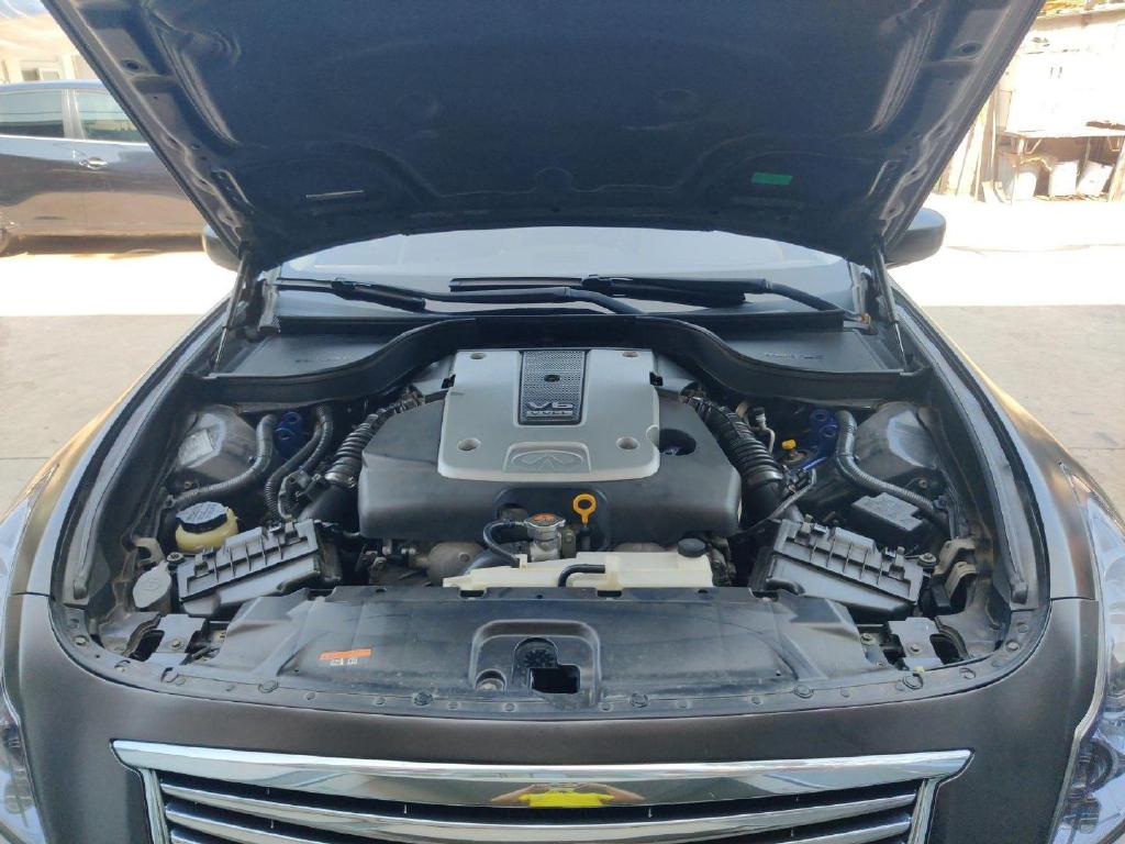 外观没什么问题,紧接着检测发动机舱,能看到机舱表面落满了灰尘,这才是正常家用车的状态!神机VQ37VHR就隐藏在灰尘下面,3.7L V6自然吸气,最大马力351匹,最大扭矩363牛米,配7速手自一体变速箱和全时四驱,在当时这动力据可不得了!