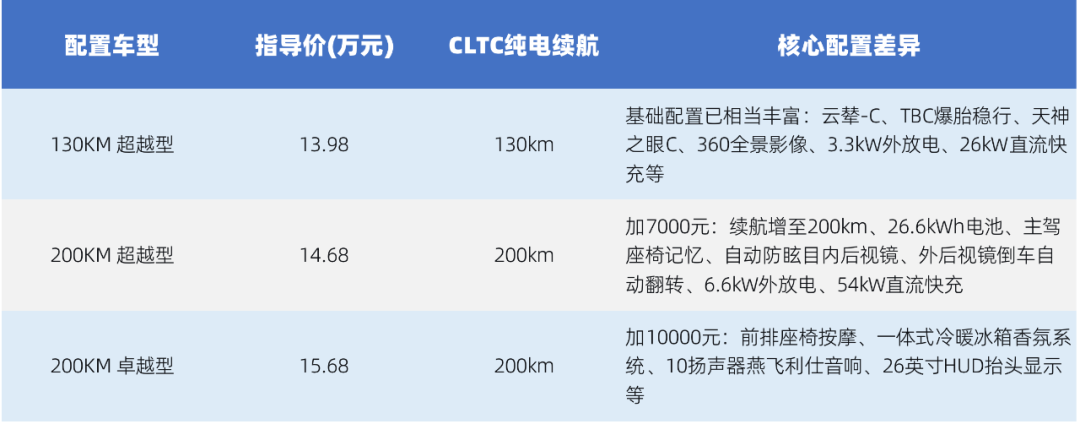 200KM 超越型在入门车型基础上加7000元,差异点在于采用了26.6kWh电池,纯电续航增至200km。这么看,7000元差价换来的是实实在在的续航提升,对充电方便的用户来说,长期下来会划算。