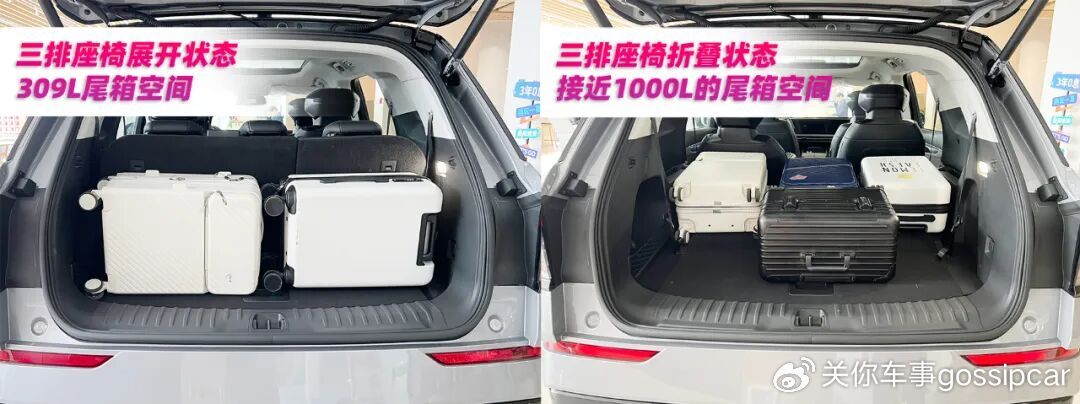 在七座满员的情况下,后备箱的空间也是很大,数据可以达到309L。大家如果要买年货,可以把第三排座椅放倒,就拥有接近1000L的空间。如果你对空间有更大需求,选择2-3-2座椅布局车型,第二排座椅还能折叠,空间接近3000L。