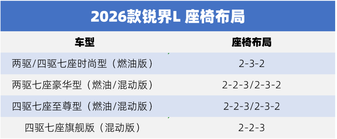 作为多口家庭,我会重点关注车辆的空间。2026款锐界L是真的大,5米车长,接近3米轴距。据我了解,这款车有2-2-3/2-3-2布局可以选,实际上不同的车型也有差异。我也做了一个表,大家可以看看。