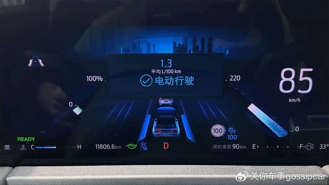 当然,这套系统还可以根据路况进行纯电行驶,或者全力运行。我开了几十公里,它的实际能耗也就6L级/100km左右,加的92号汽油,加满一箱油可以跑接近1200km。重点是这车在节假日跑长途很好用,毕竟不需要排长队充电,更不用担心续航打折,而且每公里的费用也就大概5-6毛钱。
