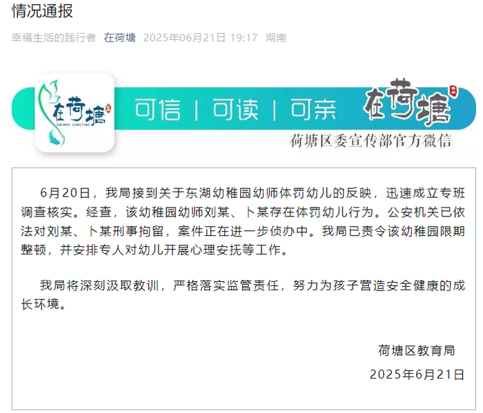 6月21日,株洲市荷塘区教育局发布情况通报:6月20日,荷塘区教育局接到关于东湖幼稚园幼师体罚幼儿的反映,迅速成立专班调查核实。经查,该幼稚园幼师刘某、卜某存在体罚幼儿行为。公安机关已依法对刘某、卜某刑事拘留,案件正在进一步侦办中。