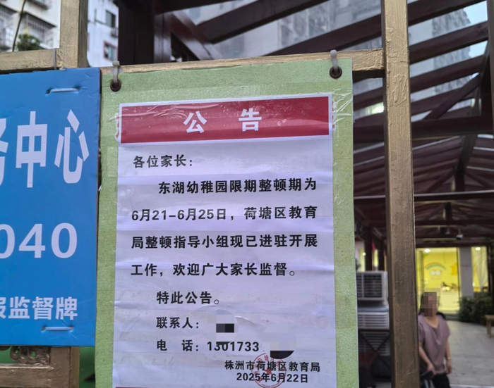 6月22日,荷塘区教育局在幼儿园门口张贴公告,东湖幼稚园限期整顿期为6月21日至6月25日,荷塘区教育局整顿指导小组现已进驻开展工作,欢迎广大家长监督。随后,记者致电荷塘区教育局整顿指导小组的相关联系人,但电话无人接听。