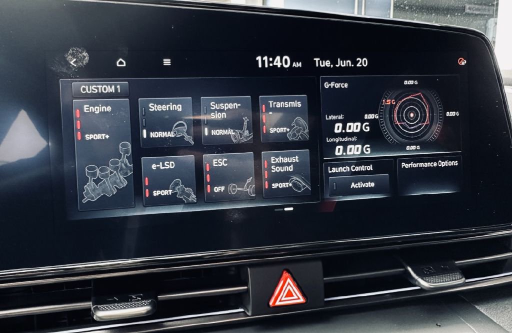 即便2.0T发动机很强,8速双离合变速箱足够聪明,但对于Elantra N来说这只是最基本的操作罢了。因为在它的方向盘上有两个蓝色的小按钮,按下之后可以进入预设好的Custom模式,此时就可进入前驱车有史以来驾驶相关可调项最多的页面当中。