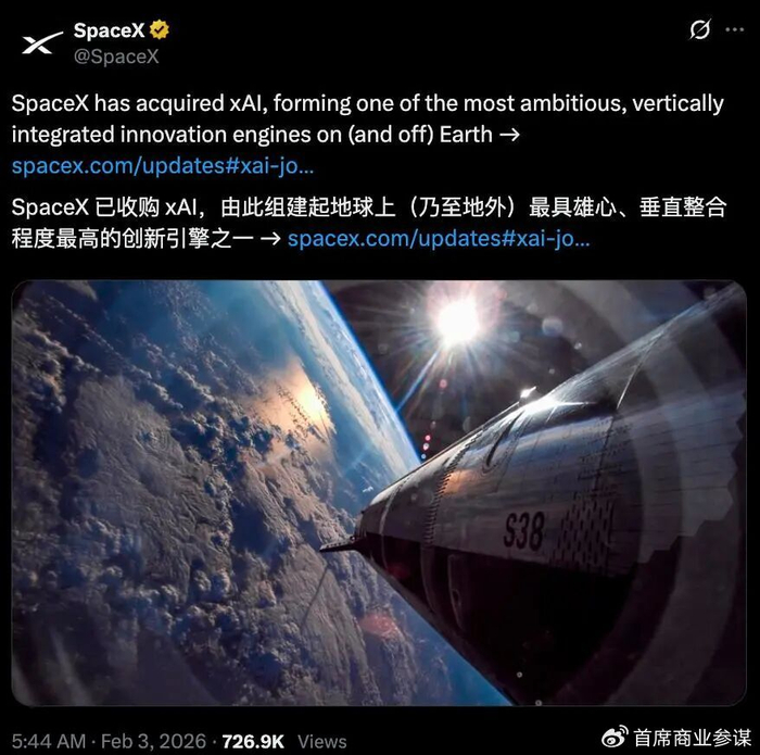 此外,马斯克最近最具爆炸性的商业动作,莫过于SpaceX正式宣布收购其一手创立的人工智能公司xAI。火箭、AI、太空互联网、卫星通信——马斯克要把能整合的全整合了。