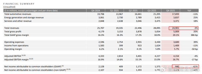 近日,特斯拉2025年第四季度财报显示,特斯拉营收249亿美元同比下降3%,净利润仅8.4亿美元暴降61%。