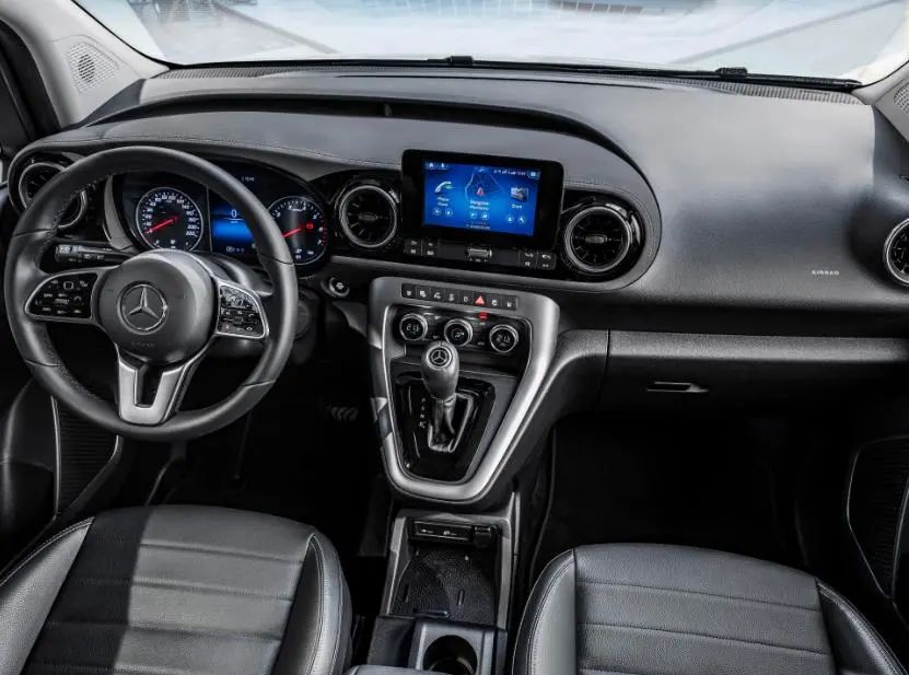 这时候该来介绍它的内饰了,如果你觉得T级的内饰也一定会很豪华,那你可能要失望了。虽然T级的内饰保留了很多奔驰家族元素的细节,但是整体风格还是实用主义。连最入门的A级车都配备的双联屏,全新T级上并没有配备,而是采用比较传统的机械仪表+中控屏的形式。