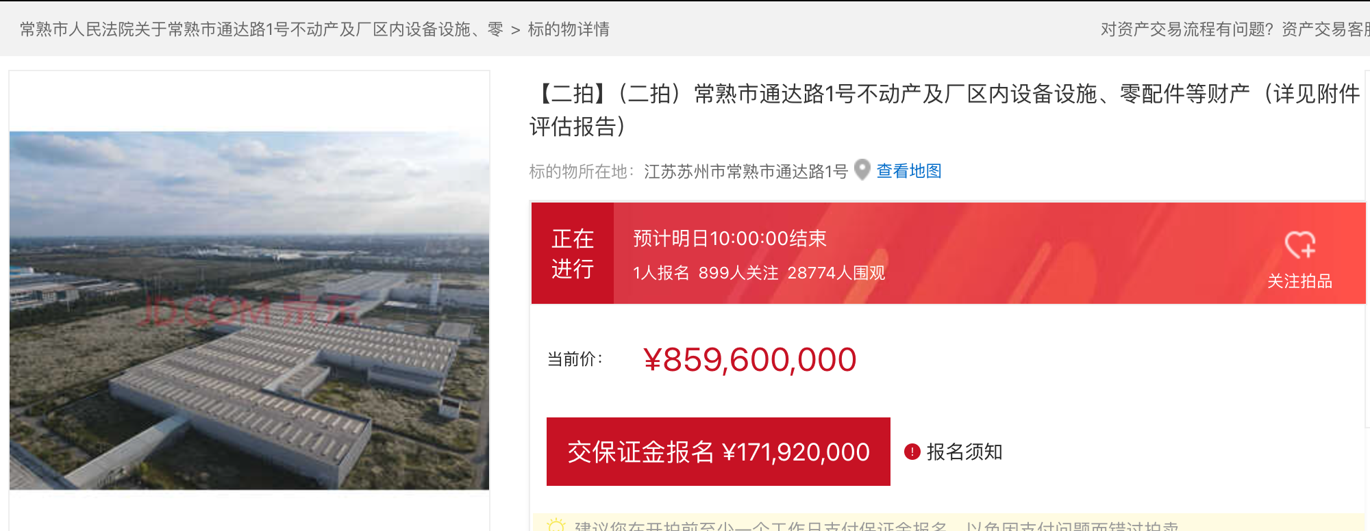 1月15日上午,界面新闻查询京东资产交易平台了解到,常熟市通达路1号不动产及厂区内设备设施、零配件等财产二拍正在进行,处置机构为常熟市人民法院。这场拍卖的起拍价格是8.596亿元,参与拍卖需要交保证金1.719亿元,加价幅度为100万元。