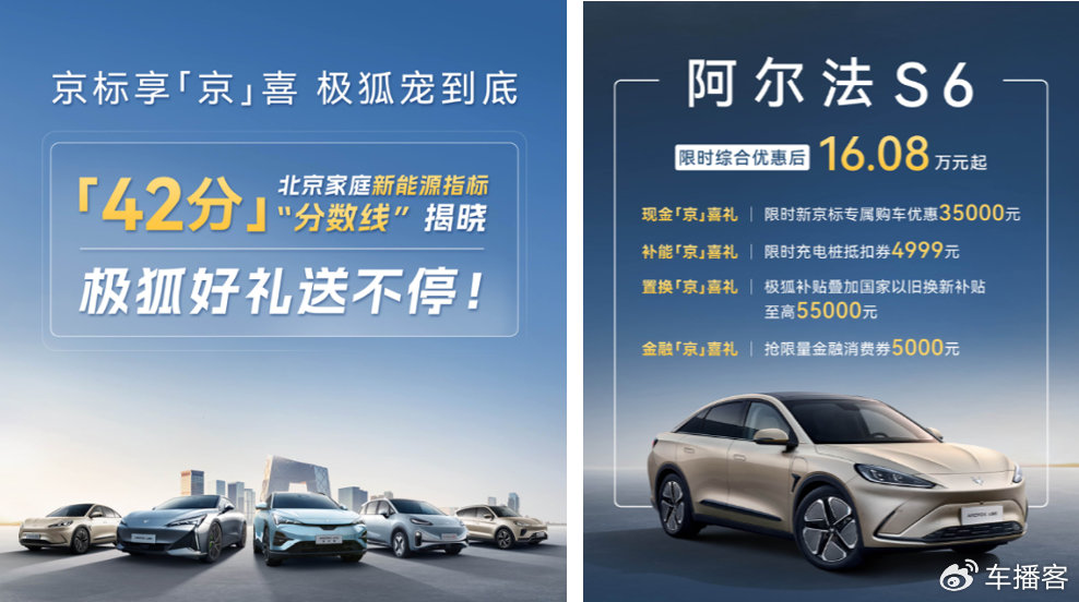 为庆祝京标用户摇号成功,极狐即日起推出“京”喜好礼:新阿尔法S6/T6车型限时综合优惠后16.08万元起,更可叠加3.5万元现金礼、4999元充电桩抵扣券、至高5.5万元置换补贴及5000元金融消费券。此外,极狐阿尔法S5(配置|询价)、T5及考拉S(配置|询价)均享受不同“京”喜好礼优惠。此刻无论你是否心有所属,这款高质平价的“京造实力派”,绝对值得你花点时间了解。