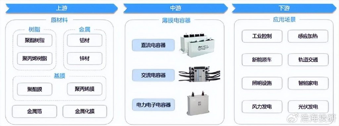 如果我们把薄膜电容的产业链打开,你会发现上游材料主要包括基膜、金属箔、导线、外包装树脂等等。基膜是核心原材料,不同材料的基膜对应不同性能的电容器。中游则是薄膜电容的生产制造商。要知道,我国是最大的薄膜电容制造国,约占全球总产值的60%以上。