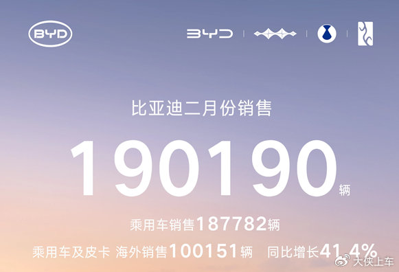 190190辆!这是比亚迪在2月份交出的新能源销量答卷。别嫌这个数字没有去年年底那么“爆炸”,在只有28天、且包含了完整春节假期的2月,能卖出接近20万辆车,这本身就是一种“统治力”的体现。