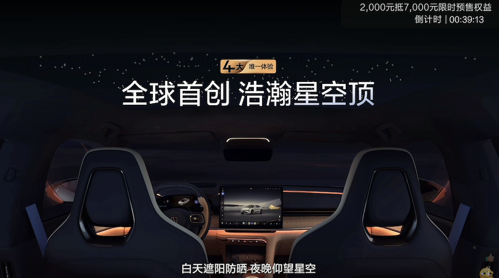 此外,新车音响系统配备了29个扬声器,为用户营造出沉浸式的听觉盛宴。新车也打造了“浩瀚星空顶”,调光天幕中嵌入了500颗可独立控制的星粒,打造星空场景。