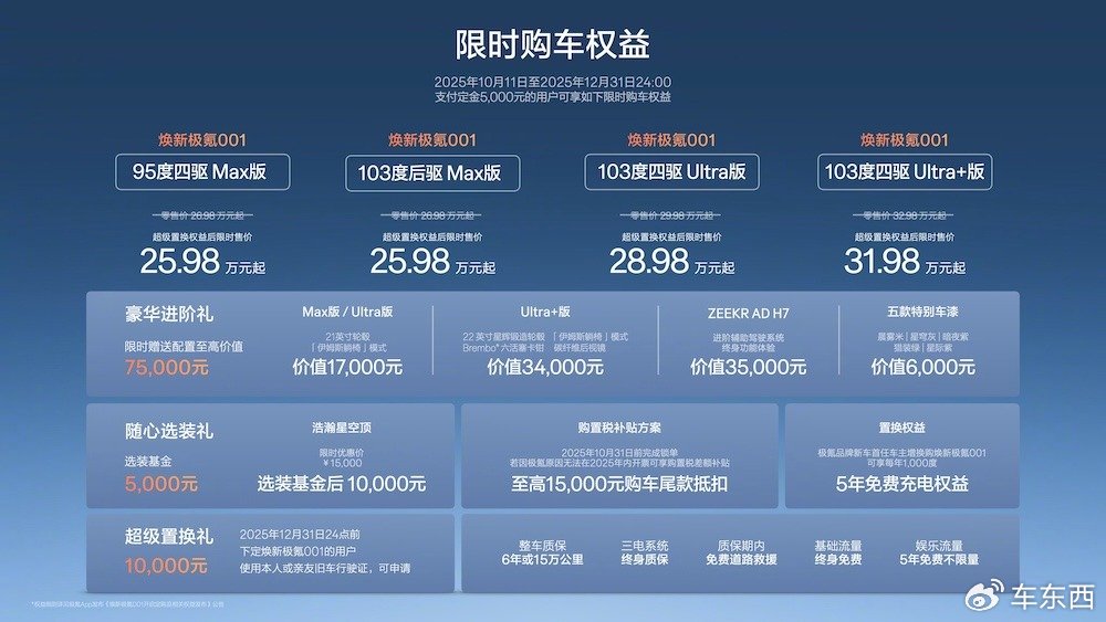 此前,极氪汽车官方明确表示,焕新版极氪001在2026年仅通过OTA和选装配置优化,无全新换代产品。这也进一步消除用户对车企“背刺”的担忧,有望提升购车信心。