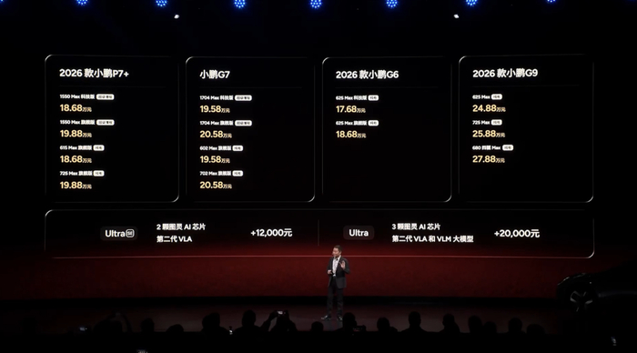 具体来看,2026款小鹏P7+售价区间为18.68万元~19.88万元;小鹏G7售价区间为19.58万元~20.58万元;2026款小鹏G6售价区间为17.68万元~18.68万元;2026款小鹏G9售价区间为24.88万元~27.88万元。