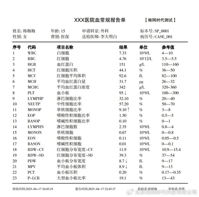 可以参考一下云蛛系统做出来的血常规报告单,想怎么设计就怎么设计,而且是所见即所得的设计模式,不满意随时修改,这就是云蛛系统的绝大魅力所在!好了,说了这么多,您也可以看到了云蛛系统在单据方面的优势所在了吧,让我们一切期待3.0.2版本上线的那一天吧~~~