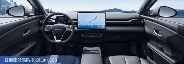 车内整体设计较为简洁,配备了三幅式多功能方向盘、悬浮式液晶仪表和15.6英寸横向中控屏,内置高阶版DiLink100智能座舱。