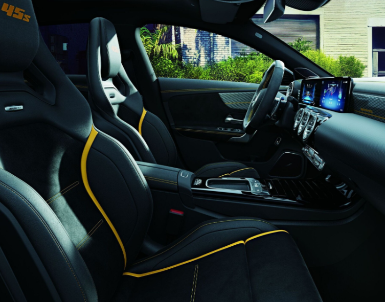 内饰上,梅赛德斯AMG CLA 45 S 4MATIC+搭载的「ARTICO/MICROCUT 黑色(黄色缝线)内饰“”AMG方向盘(纳帕皮革/MICROCUT)」「Final Edition专用AMG铝元素“、”Final Edition专用徽章(中控台)“、”Final Edition专用地板垫“,与需要花钱加装的的“AMG性能表”都将新车的运动范儿整合了起来。