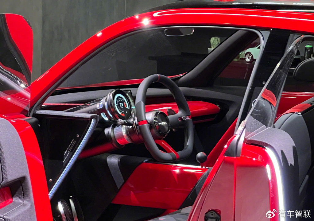 内饰将极简主义理念发挥到了极致。车内配色采用了醒目的黑色与红色搭配,充满活力。方向盘是极具简约风格的三幅式设计,并且方向盘上没有任何物理按钮,中间是马自达的字母标识。最引人注目的是,中控台区域完全没有配备传统的嵌入式屏幕,取而代之的是位于仪表盘旁的一个智能手机支架,意图让驾驶者的个人手机成为车辆的信息娱乐核心。