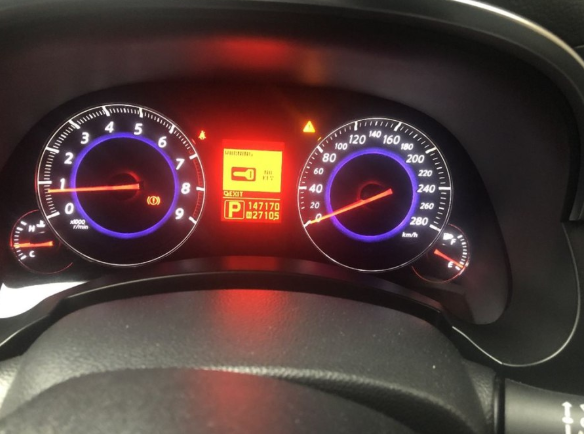 随后我们看到了这辆英菲尼迪FX50的仪表盘,公里数清晰可见,现在的这位小哥说:“我很喜欢英菲尼迪FX的外观设计,前不久在二手车市场上闲逛,无意中看到了这辆FX50,心中一直惦记着这辆车,在得确认车况良好后入手了,23万元买下,本以为赚了,但是油耗真的很高,市区油耗平均一公里2块钱。”