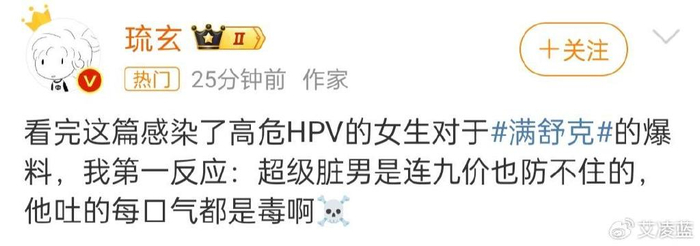 有网友怒骂满舒克:“超级脏男是连九价也防不住的,他吐的每口气都是毒啊。”