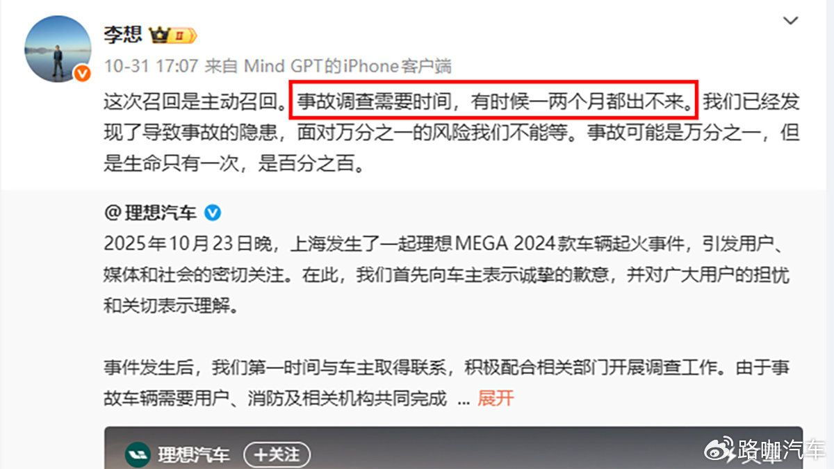 理想汽车产品线负责人在社交媒体上的核心信息为,事故发生前4个多小时,云端有电池绝缘故障报警,联系并提醒了客户维修,同时理想很多高管都是此批MEGA车主,且此前未发生热失控事件,有些懈怠。