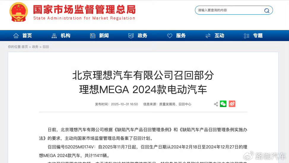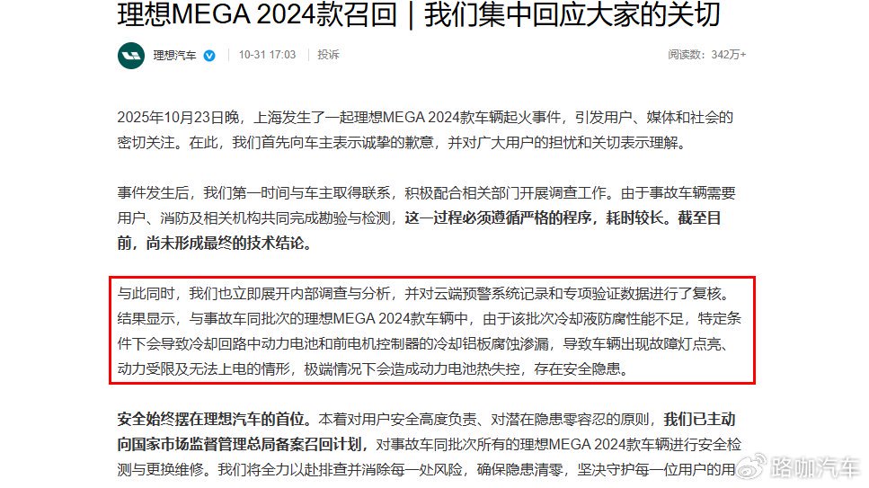理想的公告核心信息为,2024年12月27日前的MEGA车型,冷却液防腐性能不足,特定条件下会导致冷却铝板腐蚀渗透,极端情况下可能引发热失控。