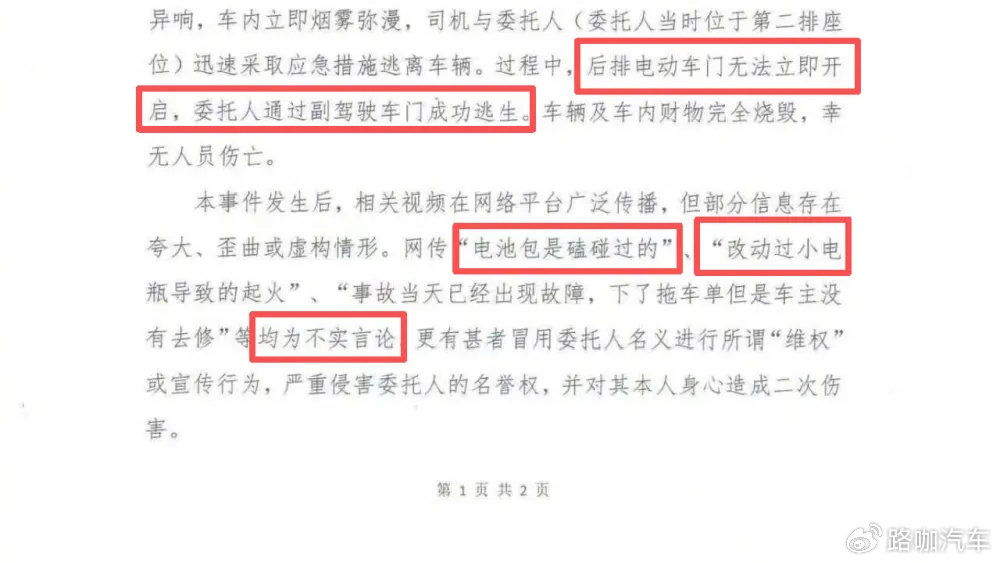 车主方面给到的核心信息为,否认网传 “电池包磕碰受损”“改动小电瓶导致起火”“事发前故障未检修” 等,强调车辆无外部损伤、无改装,且不存在 “已下拖车但未维修” 情况。