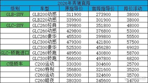 公开报道显示,奔驰在2月第一天对部分车型的厂商建议零售价格作出了调整,涉及 C 级、GLB、GLC(配置|询价) 以及 GLC 轿跑四大系列,降幅从 3.37 万元到6.90万元不等,覆盖轿车和 SUV 两大核心细分市场。
