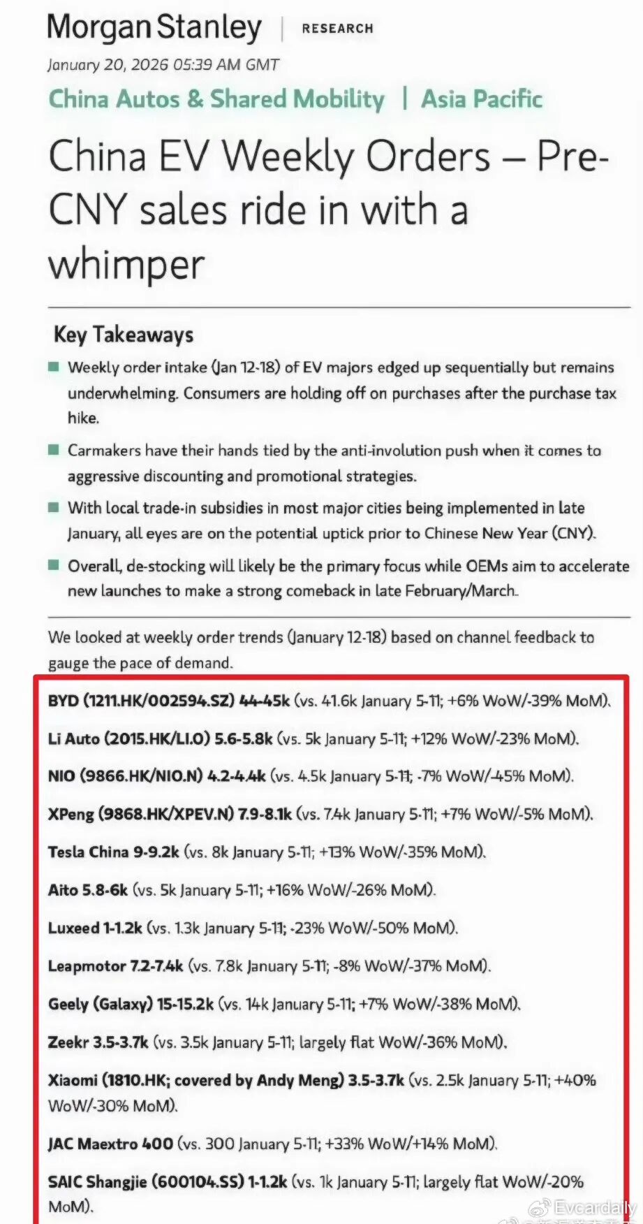 网络流传的摩根士丹利报告显示,其根据渠道反馈,统计了每周国内主要电动车品牌的订单数据。根据摩根士丹利数据,1月第三周(1月12日-1月18日),国内电动车厂商周订单数据环比略有上升,仅有个别品牌出现了下滑。摩根士丹利认为,综合订单表现并不理想,这是因为2026年购车补贴退坡后,消费者推迟了购买计划。