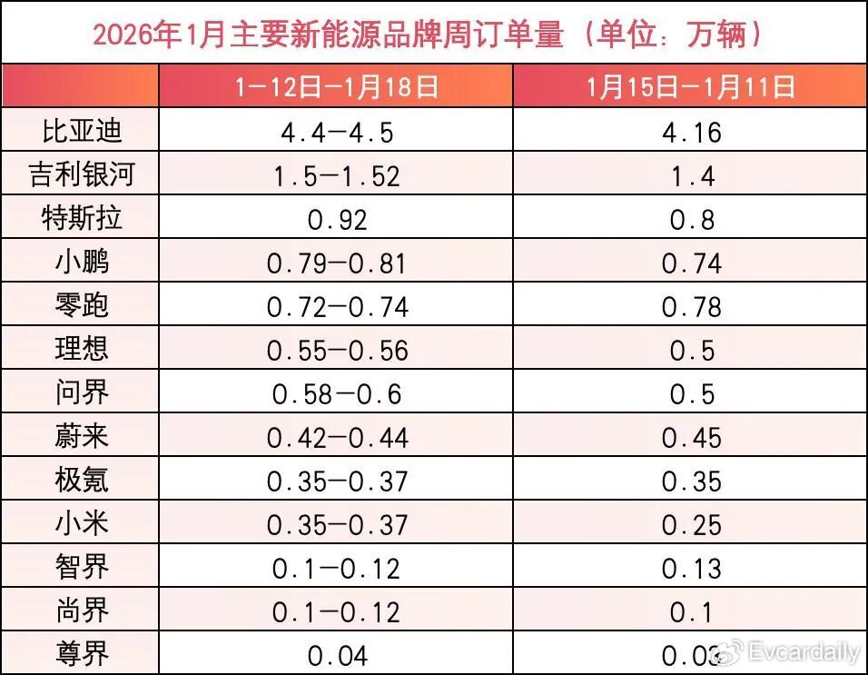 除了上述造车新势力外,摩根士丹利统计了几个国内头部的电车品牌,以及传统车企新品牌的订单表现。其中,比亚迪上周订单为4.4万—4.5万辆,较前一周增长了约0.24万辆,稳居榜首。近期,比亚迪以“插混纯电长续航”为卖点,开启2026年的产品攻势。