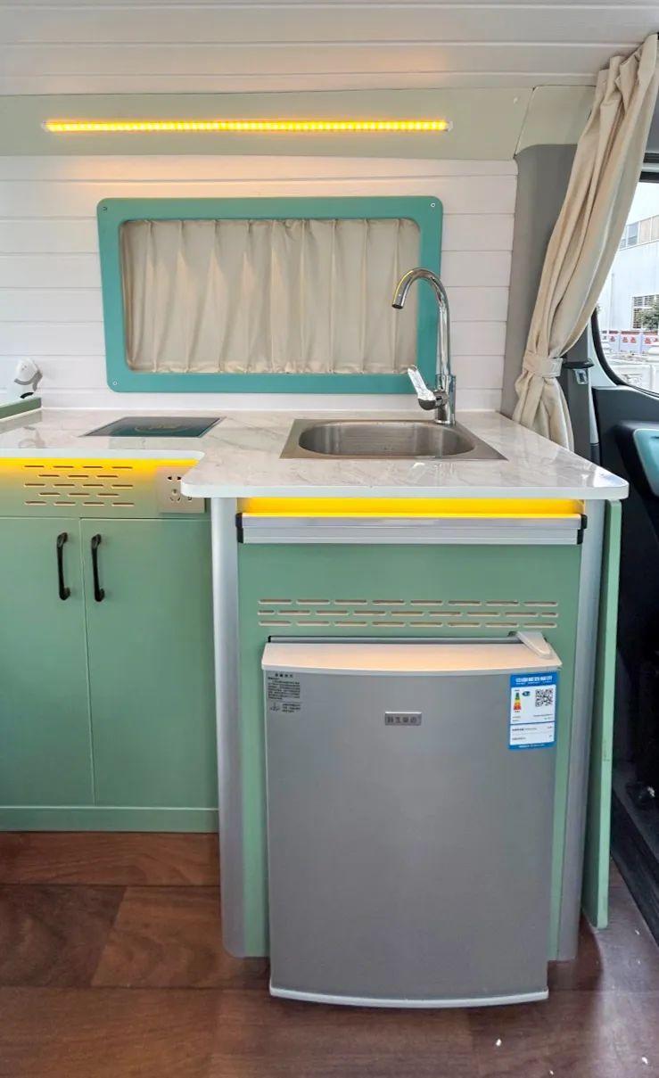 会客区一侧为厨房区域,料理台面配备常规的电磁炉、洗菜池,台面下方配备储物柜,可以存储旅途所需的碗筷或调料。储物柜一侧配有50L英得尔冰箱,可供车主冷藏冷冻食物。