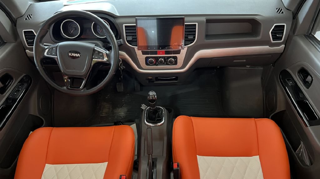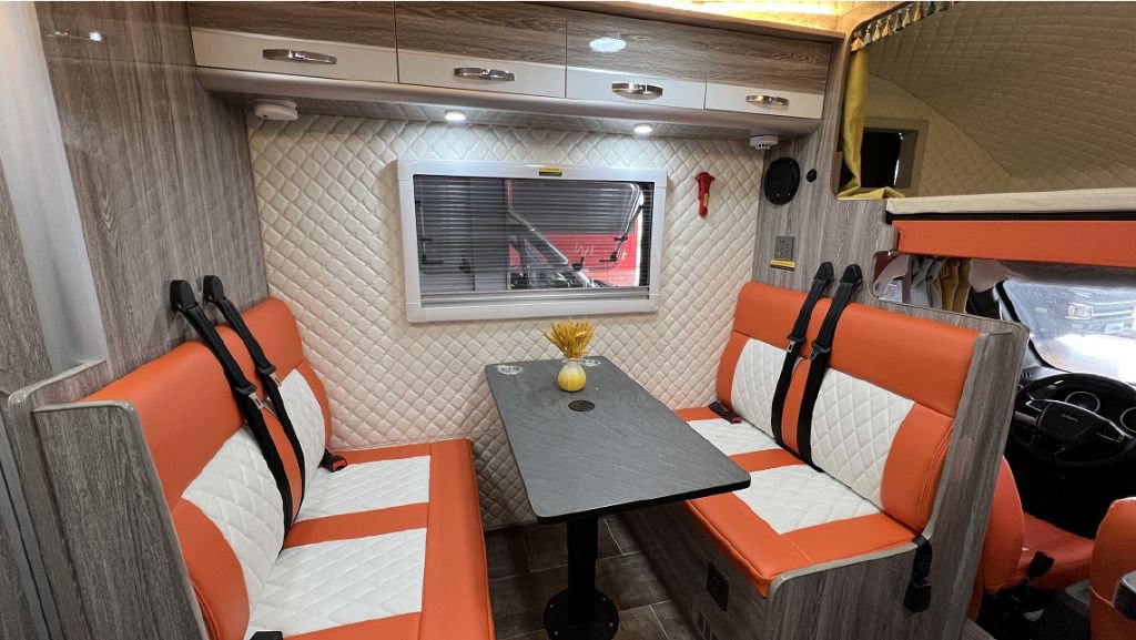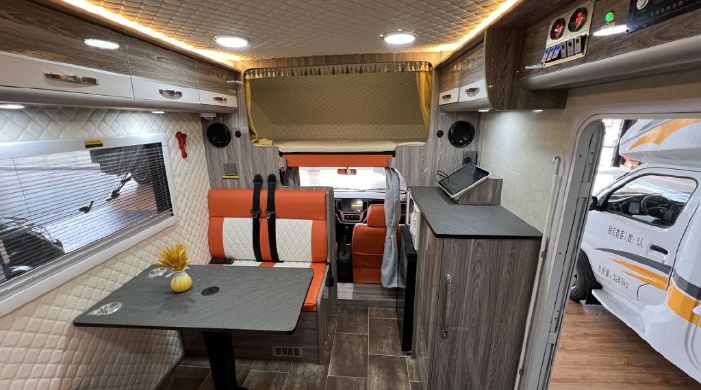 驾驶室为两座布局,用户可以从中间直达后方生活区。区域内配备有三幅式方向盘、炮筒式仪表盘、大尺寸的液晶显示屏,拥有倒车影像、倒车雷达,播放视频等功能。