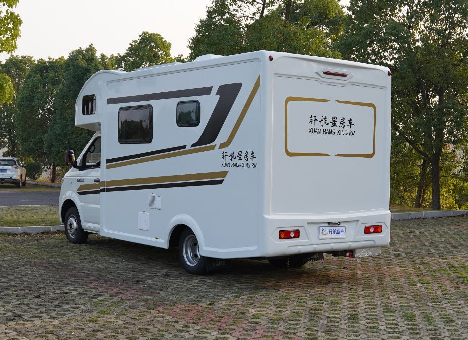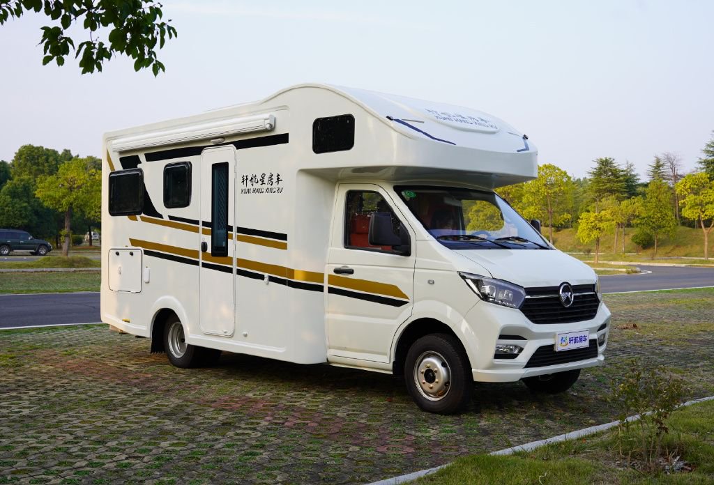 整车采用了一体成型式玻璃钢材质车身,大额头做了流线型设计,额头两端设计有警示灯,保障夜晚行车安全。车身外侧配备有储物舱、户外遮阳棚等设施。
