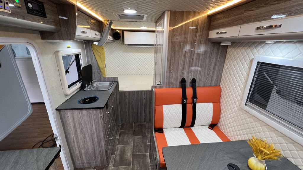 车厢内部采用了一致的内饰配色,整体性十足,鲜亮的座椅包覆让车厢内部活力不沉闷。用材方面,车内采用了E0级房⻋环保专⽤板材,铺设有⾼档防滑耐磨地板⾰,内部空间尺寸为3650×1930×1850mm,空间宽裕,舒适旅居生活更有保障。