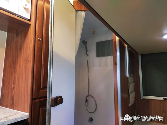 卫生间紧挨厨房,固定式的独立卫生间在B型车中相当少见,因此它也拥有较好的防水防漏防潮设计,使您在旅途中可以放心使用。卫生间内部配置也十分齐全,内置赛特福德便携式马桶、双向换气扇、淋浴、梳妆镜等,能够充分满足您与家人在旅居途中的如厕及淋浴需求。