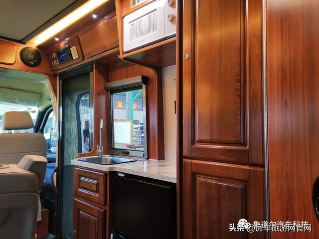 厨房区域位于会客区对面,将乘客中门打开即可进入整车的内部厨房区域,实木家具的装饰搭配大理石台面使厨房整体看起来质感极佳。操作台上配置有不锈钢带盖洗菜池与水龙头,方便您在此处理食材。右侧墙面上设计有五孔插座,方便您在此使用便携式电磁炉或其他电器,为您的旅途带来更多美味。厨房顶部配有微波炉,可用来加热食材。多个储物空间可用来放置烹饪所需的厨具及餐具,随时拿取十分方便。洗菜池前方配置有外推窗,能够及时排出油烟,保护您与家人的身体健康。操作台下方设计有车载85L冰箱,能够满足1-2人出门在外的使用,保证食物在旅途中的新鲜与口感,为您带来舌尖上的美味与安全。厨房右侧设计有大型落地式衣柜,可用于放置西装或礼服等正式服装,保证服装的平整,以便应对突发的商务活动。