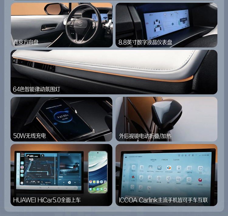 内饰造型和新款卡罗拉相似,整体更加的规整和简洁,确实更符合时下消费者的审美。其采用内嵌式液晶表盘+悬浮屏设计,使用了8155P车规级芯片,支持HUAWEI HiCar 5.0、Carlink等手机互联。新车还全系标配TSS 3.0智能驾驶辅助,包括50W无线充电、64色律动氛围灯、一体式的运动化座椅等配置都有。