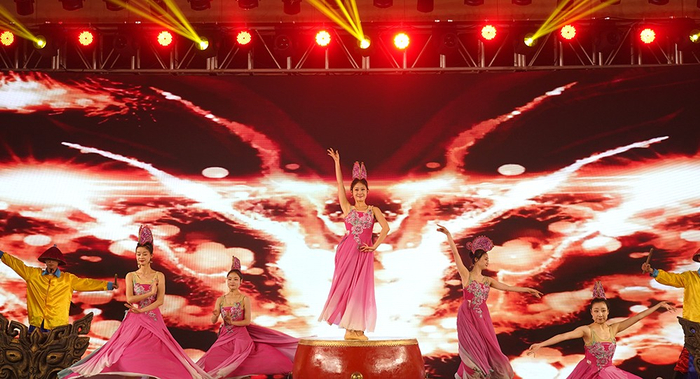 在晚上举行的中国品牌人物优秀企业家交流晚宴上,来自横店影视城艺术团的演员们献艺了精彩的《鼓上舞》、《向天再借五百年》、《盛唐印象》等节目。