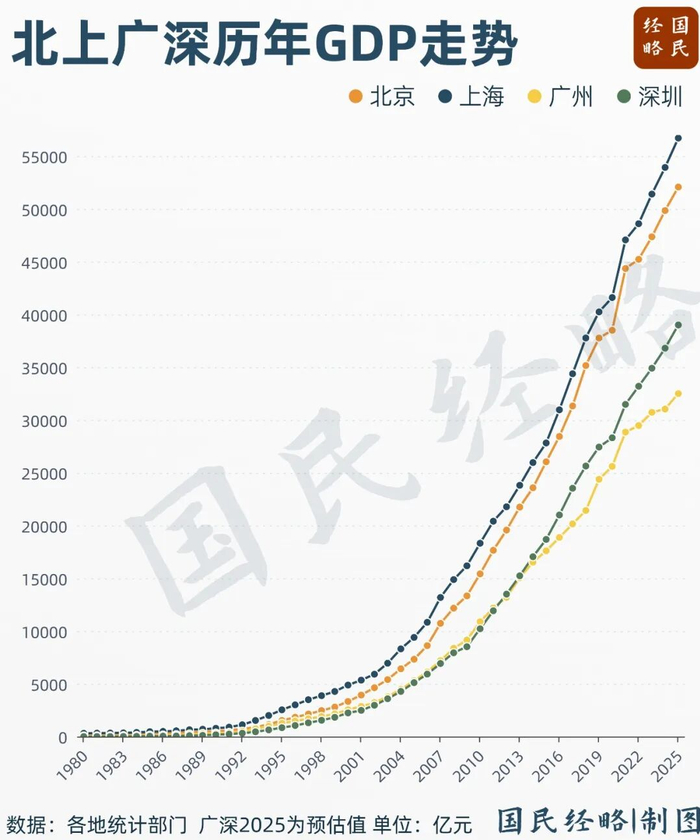 曾几何时,广深与京沪经济齐头并进,如今京沪先行一步,大幅拉开差距,将城市GDP推向新的高度。